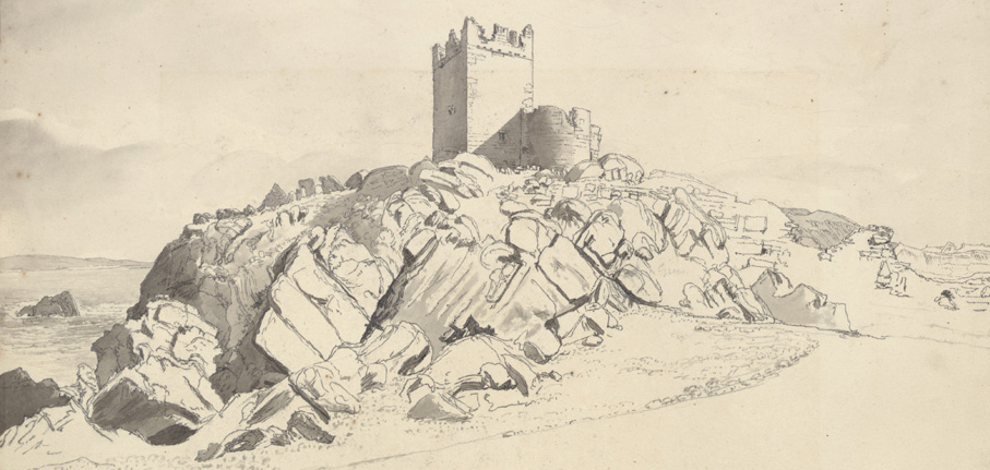 The site is known locally as ‘the Castles’. I believe this is because although what we see today is a single keep, the site originally would have consisted of the keep located within a bawn wall along which were a number of towers. This is what is shown on a sketch included in the Ordnance Survey Memoirs from 1833-5[9]. Carrickabraghy has a strategic location with a panoramic view and is easily defended, being located on a promontory surrounded by water on three sides.