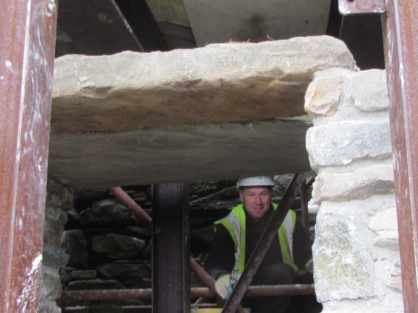 Seamus Doherty working on reinstated lintel and doorway in the east wall of the keep