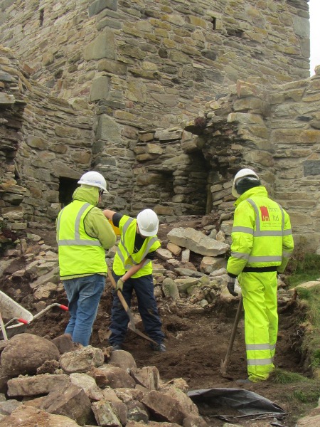 Archaeologists clearing away surface stone from round tower